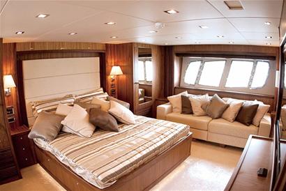 这艘“战舰108”限量版游艇身着令人惊艳的高贵的香槟色。据了解,只是这个香槟色的船漆价格就高达600万人民币,需要工人花费3个月的时间来完成上漆工作。游艇共有三层,宽敞的甲板提供了充足的娱乐和休闲空间,船舱内部独一无二的设计容纳了所有能够想象得到的精美与奢华,其中位于低层区域的休息区有包括主套房在内四个卧室,每个卧室都带有独立的卫生间,而主卧中更是配有56寸液晶彩电等高端影音设备;同时,船舱内的所有家具均采用美国黑胡桃木和优质小牛皮。而为了突出这条游艇的尊贵之处,游艇顶层特别设计了运动飞桥,并配以按摩浴缸,前部甲板上还有一个超大的日光浴区域。除了游艇本身豪华的硬件设施外,船公司还向船东提供4名专业的水手,为船东驾驶游艇以及提供专业游艇养护这样的多对一的贴身服务。