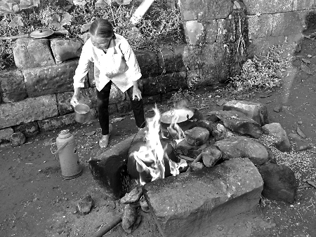 记者随即来到白坪村六社,在村子中间的一片居民房前,看到了用石头和水泥搭建起来的灶台,这个灶台就是“地火”的燃烧处。已经86岁高龄的彭婆婆正在“灶台”前,用一个不锈钢的杯子在锅里打水。