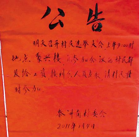 前日下午,羊城晚报记者在黎洲角村公告栏看到,一张红色的公告上写明:“明天召开村民选举大会,上午9时,地点,聚兴楼。凡参加会议的村民都发给工资,按到会人员支取。请村民准时参加”。落款是“黎洲角村委会”,公告日期为2011年1月4日。