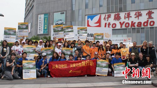 中新网成都5月15日电(陈婧婧)15日下午,5队成都“拜客”(Biker)小组从成都万达广场,响应亚洲动物基金发起的“爱动物 拜客行”活动,一起通过低碳环保的骑车和网络宣传方式,向公众宣传关爱动物的信息,号召普通民众“从身边做起,关爱动物我行动”!
