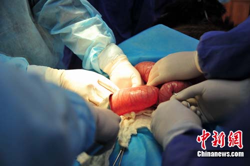 5月28日,在例行检查中,科研人员发现“松雅”再次出现食欲下降、活动量减少现象,并于次日排出少量粘液、食欲废绝。研究中心遂立即对松雅进行麻醉检查,发现其腹部胀气,初步诊断为低位肠梗阻。在随后进行的X光检查中,科研人员在其直肠道狭窄处上段发现大量粪团,“松雅”被确诊为肠梗阻。