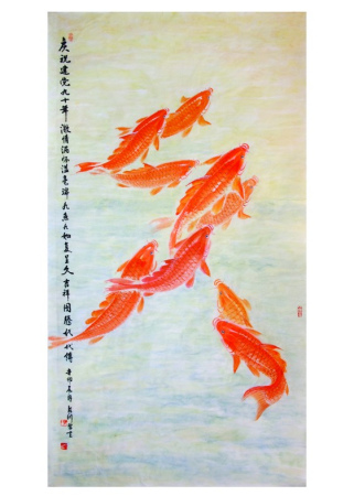 适逢建党90周年,郭占川满怀激情,用六尺生宣创作了两幅诗书画合璧的艺术精品。“永”字由七条鲜活的黑色鲤鱼组成。郭老赋诗一首作为横题,上写“纪念建党九十年,挥毫泼墨鱼翩跹;画呈永字寓深意,党风民意永相连。”“久”字由九条鲜红锦鲤组成,群鱼由左向右上方鱼贯而出,展鳍翔泳,同行不悖。郭老还在画幅的左侧作一长题:“庆祝建党九十年,激情满怀溢毫端;九鱼九如复呈久,吉祥图腾代代传。”(记者 代晴)