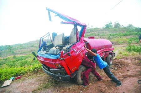“当时车突然翻了,天旋地转,我眼前一黑就没了知觉。”杨泽忠回忆称,由于白治庸从来没有来过这里,对路况不熟,加上路沿外侧塌陷,洒水车一下子向右侧翻,摔下了距路面3米高的荷塘中。“当时驾驶室被压在了下面。”杨泽忠说,几分钟后,他和王洪醒来,二人敲碎车窗玻璃爬了出去。而此时白治庸已被严重变形的车头埋住,只能看见肚子和一截断掉的手臂,二人怎么喊他也喊不答应。