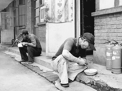 拿了3块油饼,盛上半钵白菜粉条,老李开始吃午饭。一天之中,也就这半小时,他能休息一下。每天忙到天黑,一个月下来,顶多能挣2000块钱。除非赶上下雨天,老李基本不休息,平时也没什么娱乐,“累得难受,没那么多闲工夫”。