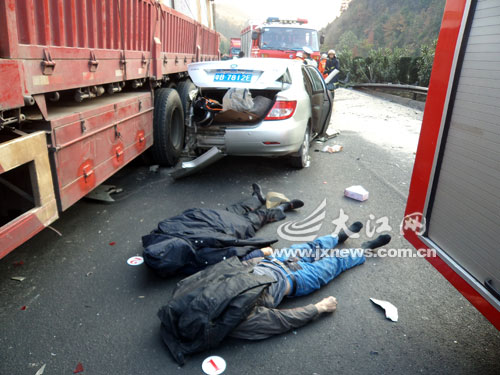 记者赶到现场看到,一辆福建牌照的黑色小车四脚朝天,旁边一辆广东牌照的白色小车内已证实两人死亡两人受伤。据交警介绍,事发时,黑色小车由南昌开往赣州方向,不知何故飞起来,穿越中央隔离带撞上白色小车。
