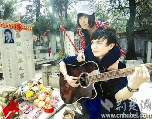 男子携妻弹吉他唱婚讯为过世15年母亲扫墓(图)