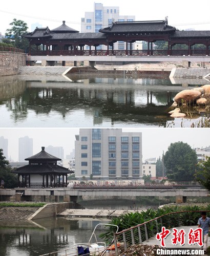 2011年6月28日拍摄的南京金川门廊桥,古色古香(上图);2012年7月4日,暴风雨掀翻廊桥后的现场已经被清理完毕(下图)。(电脑拼版图片)中新社发 泱波 摄