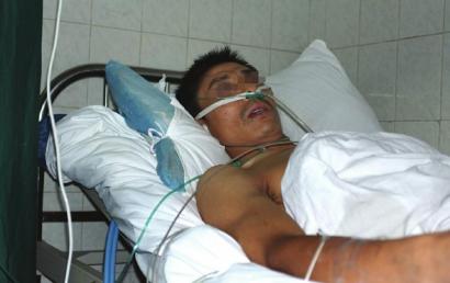 昨晚7点30分,记者在崇州市第二人民医院见到了郑春银。院方的诊断书写着,“病员被他人用高压气塞肛,直肠前壁有一长约4-5厘米的破口,大量粪石及少量血凝块流入腹腔。”据工友说,事发后郑春银大量便血,腹部鼓胀得像个气球,情况极惨。