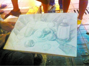 小伙子身边还放着一根棒棒,和一个装着画纸的白色塑料口袋。其间,他时不时地从发黄的衬衫口袋里,掏出外行人看着差不多的另一支画笔,斜握着移动,动作看起来娴熟又专业。小伙正在画一幅素描,上面有酒瓶、水杯、餐盘、水果……看起来还有一定的绘画功底。
