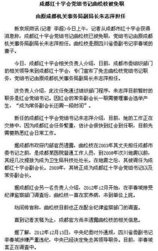 今日上午,成都市红十字会消息称,成都红十字会党组书记曲松枝已被免职,党组书记由原成都机关事务局副局长朱志萍担任。曲松枝是原四川省委副书记李春城的妻子。据成都市政府内部官员透露,曲松枝在2003年其丈夫担任成都市委书记之前,是成都某医院普通工作人员。