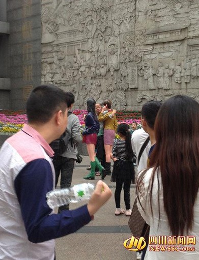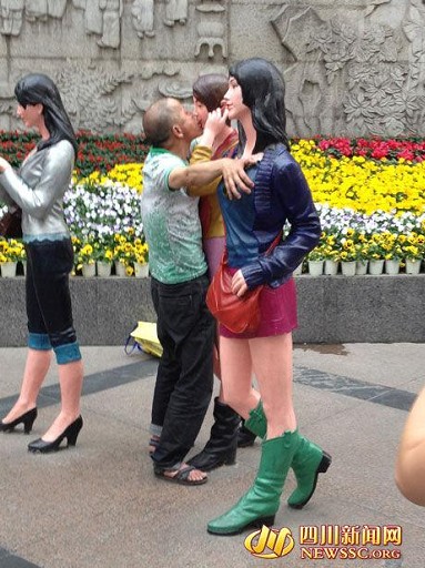 成都闹市一男子舌吻女雕塑 路人称神态投入(图)