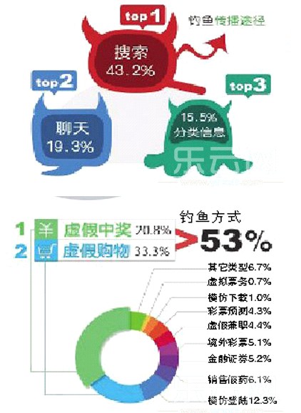 报告还指出,不法分子还会对网民做用户分析,利用消费者贪便宜的心理诱惑其上当。例如彩票、游戏、话费充值、中奖信息等,而其中已虚假中奖、虚假购物最多,所占比例高达53%以上。而骗子网站传播的主要途径为搜索、聊天和分类信息,其中搜索所占比例最大。