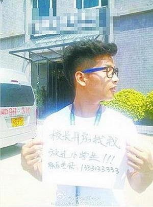 记者看到,照片上的年轻男子打扮时尚,侧着脸,双手拿着一张白纸,上面写着:“校长开房找我,放过小学生!”并且注明联系电话,背景还有一部厦门牌照汽车。不过,细心的网友发现,该手机号码只有10位数。记者注意到,上传该照片的网友“@天使嫁期-连sir”,新浪微博认证为“厦门天使嫁期婚纱摄影主管”。有网友爆料,照片上的人是博主的同事“@天使嫁期-我是老刘”,该博主的描述是“厦门天使嫁期-首席摄影师-刘sir”。
