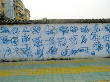 蒲勇坤说,去年9月,他就曾在西华师大校外围墙上画画。“当时我用的是家里做卫生的扫帚和一盆墨水,随意画的。不像字也不像画,我自己也不懂是什么意思,就是想要创造一种符号。”令蒲勇坤遗憾的是,第一次的创作还没有被广泛欣赏,就被城管涂白了。