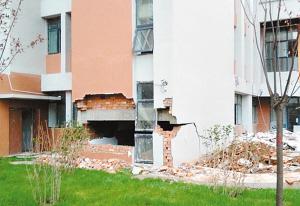 4号楼单元门前的一段墙体由于地面沉降发生坍塌