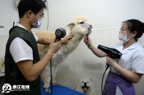 5月30日,杭州复兴南街一家宠物店来了一位“贵客”,一只从澳洲飞来的羊驼,它被主人带到这里洗澡。羊驼在网上称为神兽,又叫“草泥马”,这只羊驼今年一岁半,雄性,正值成年,是主人花了6万元从澳洲引进的。这家伙性子很温顺,洗澡时既不乱叫,也不会乱动。