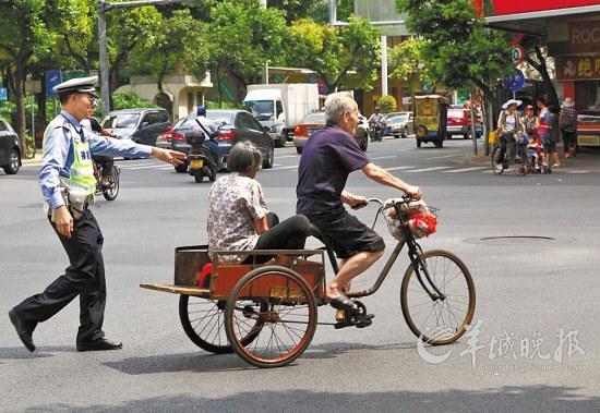 交警正在对一辆三轮车横穿马路行为进行制止