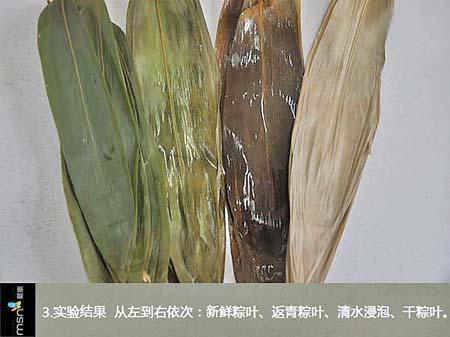 左起:新鲜粽叶、返青粽叶、正常浸泡粽叶、干粽叶