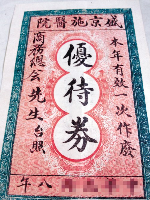 记者注意到,“优待券”的背面清楚写着这样一段话——“敝院设立奉天小河沿三十余载幸蒙各界好义,诸君历年捐助,此善举敝院不胜感激之至,今持呈优待券数纸,凡*贵戚友持此券至院就诊无论何时,敝院必竭诚招待,不收特别诊查费,盛京施医院具。”