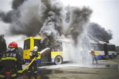 去年8月31日,北京消防局组织汽车火灾逃生实验中,起火公交车2分钟内被浓烟包围。消防部门提醒,乘客最好弯腰移动逃生。 A16-A17版资料图片(除署名外) 新京报记者 浦峰 摄