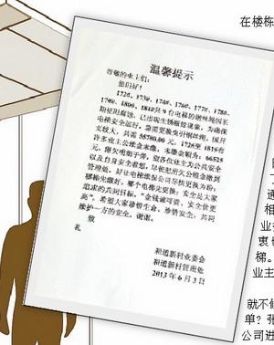 拨打本报读者热线968820的居民告诉记者,电梯目前还在运行中,但时不时会出现小毛病,譬如电梯门关不上,或者哐当哐当响。这张“温馨提示”是6月3日贴在楼道的,“温馨提示”写明,“……电梯的钢丝绳因长期使用腐蚀,已出现生锈断股现象,急需更换曳引钢丝绳,共需55780元。但许多业主公维金未缴,未缴金额达66525元,希望各位业主尽快把所欠公维金缴到管理处,哪梯先缴好,哪个电梯先更换……”