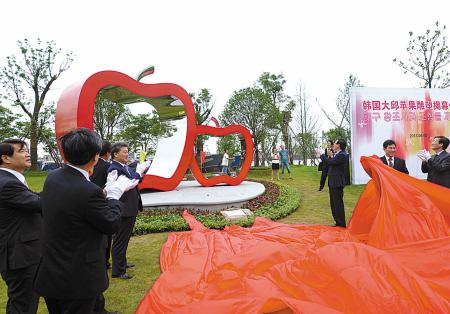 韩国大邱赠宁波雕塑 双方市领导为“苹果”揭幕