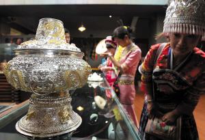 为庆祝文化遗产日和南博会的到来,云南民俗博物馆特别推出“云南民族村非物质文化遗产传统技艺作品展”,向宾朋展示绚烂的云南非遗文化。此次展览共展出作品480件,涵盖白族手工银器技艺、剑川木雕技艺等代表作品及衍生产品。在众多展品中,一个造型是云南传统烧炭火锅的白族手工银器特别引人注目。云南民俗博物馆馆长杨甘雨介绍,这叫簪花鎏金嵌珊瑚龙纹银火锅,由云南民族村白族铜银器手工制作传承人董江山创作。