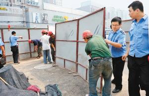 道路上施工本身就会影响交通,如果再超范围或超期围挡,更会造成拥堵。昨日,市政部门联合交警、地铁办对围挡施工工地进行突击检查,对一些超范围围挡、围而不建的工地现场纠正,减小道路交通压力,缓解交通拥堵。