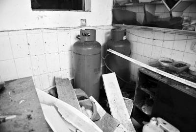 上午10点40分左右,记者进入事故现场,看到餐馆厨房内虽无火烧痕迹,但爆炸时产生的巨大冲击力已将天花板及餐厨用具基本震坏。厨房角落内摆放的两个1米5高的液化气钢瓶,从液化气钢瓶至燃气灶近4米的距离,用来供气的管道均为燃气软管,远远超过规定长度2米。此时,在燃气灶的连接处,一段软管已经焦黑变形。