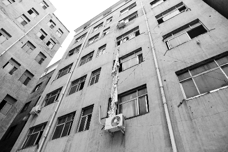 这栋居民楼的瓷砖上还留有未被擦拭干净的黑灰,从一楼一直到五楼。一个挂在墙外的空调外机,塑料壳已被完全烧化。
