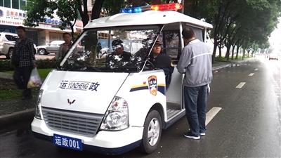 6月20日,记者在石嘴山市采访时发现,一辆闪烁着警灯的敞篷巡逻车缓慢行驶在大武口区贺兰山南路上,车身有“运政”字样和图案、车前下方挂有自制的“运政001”车牌,前后排分别坐着两名穿制服和未穿制服的男子。敞篷车驾驶员告诉记者,他们是石嘴山市道路运输管理局职工,在街头执行巡逻任务。
