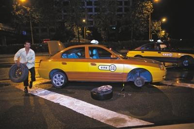 出租车司机正在换备胎。前晚,安华桥西侧主路上,一个小坑的外棱令20余辆车爆胎。新京报记者 周岗峰 摄