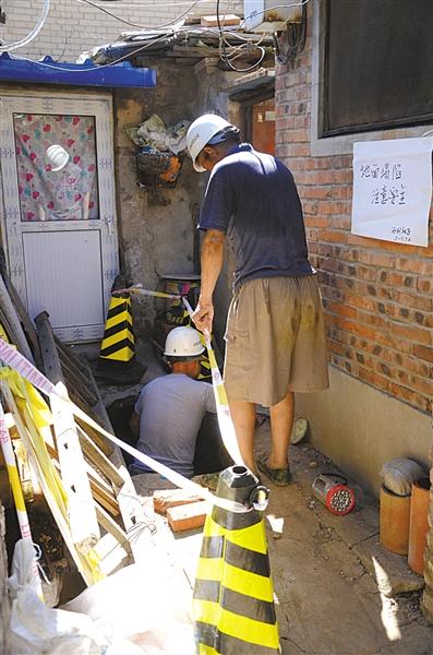 昨日,东城区民防局的工人在抢修塌方处。新京报记者 黄颖 摄