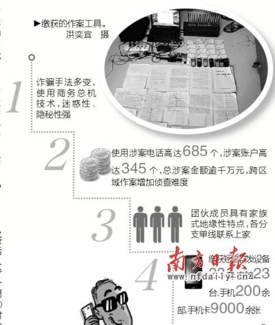 通过对作案电话号段和作案手法进行串并,专案组发现,2012年以来该团伙在佛山涉案警情高达上千宗,使用涉案电话高达685个,涉案账户高达345个,总涉案金额逾千万元。