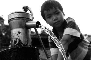 7月7日,肇庆封开县南丰镇,因为江水可能受到污染,一名男孩从自己的水井中取水。