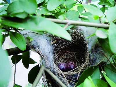 在市民武先生家窗前,长有一棵冬青树,高2米多,一枝树杈正好伸向窗台上,两只白头翁夫妻就在窗台前树枝上,叼来白色的包装带和绳子,在冬青树上编织起了窝。在爱巢编织好之后,白头翁就在窝里开始下蛋了,接连两天产下2枚蛋。2枚呈豆沙红色的鸟蛋上,布满紫色斑点,大小和鹌鹑蛋一样,十分可爱。白头翁夫妇的分工开始十分明确了,每天雌白头翁负责孵蛋宝宝,一般是不出窝的。雄白头翁则担负着送餐和站岗放哨的功能,只要发现有“敌人”诸如小麻雀入侵领地时,它便发出叽叽喳喳的叫声。