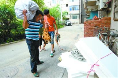 下午1点,3名工人将车停在刘丽英家楼下。将水泥、沙子、保温板、工具等一一卸车后,3名工人叮叮当当忙碌起来。
