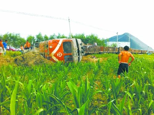 一个多小时后,本报记者赶到现场,现场一片狼藉:小火车,车厢20节,满载石子,第一节车厢出轨侧歪,车头出轨侧翻在玉米地里。大吊车,正在调运被小火车撞翻的客车,地上散落的客车后挡铁皮上,显示该客车车牌号为“豫QA5953”。