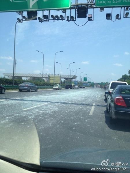 上海徐浦大桥下引桥卡车洒落玻璃 致拥堵数公里