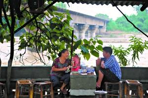 在雷雪梅和她爸爸的带领下,我们还徒步去看一座被洪水冲击错位的桥,途中路过一座铁路桥,因为桥梁又高又宽,桥墩也非常粗壮,经过这里的水流格外湍急,桥下也格外凉快,就见紧邻河边的几棵大树下,搭着一个棚子摆着几张桌子,每张桌子都围着几个村民悠闲地喝茶聊天,对面的门脸房上还挂着几个鸟笼子,几个人在打麻将。“他们不害怕吗?”我问,雷雪梅的爸爸“嘿嘿”笑着说,“现在水已经退了,这里又凉快。”他说地震时也一样,余震还没有完,很多人就在家里开始打麻将了,“地震以后,人变得更坚强了。”