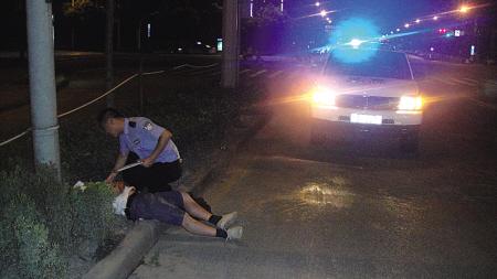 图为交警正在救助“醉卧男”。(朱忠义 摄)