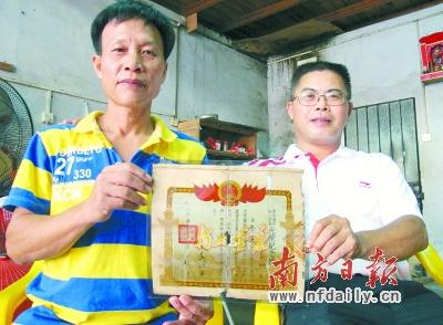 邝光革命烈士证被收走后,邝家一直珍藏着这张革命牺牲军人家属光荣纪念证(左为邝迪河,右为梁健胜)。 杨兴乐 摄
