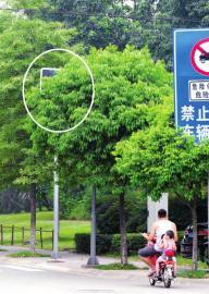 7月25日,蜀祖路附近一个红绿灯,隐藏在绿树中。
