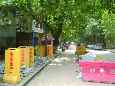 施工材料霸占了公交站台和马路。陈 郁 摄