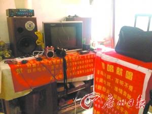 昨天上午,记者在龚伯家看到,一个大音箱立在客厅中间,电视柜上除了电视机外,还有4个小音箱以及3个麦克风。