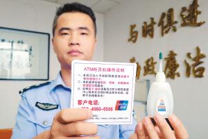 今年7月4日凌晨4时许,解放路一家银行的保安在银行的监控上发现,一名男子来到银行的ATM机前后,并没有取钱,而是东张西望,观察周围情况,接着,他又开始拿出一个装胶水的瓶子往ATM机的出钞口涂抹。发现情况可疑,4名保安立即来到ATM机前,这时,已经用502胶封住ATM机出钞口的男子正将一张自制的ATM机操作说明往取款机上张贴,保安立即上前将他抓获,并向公安新城分局经保大队报警。
