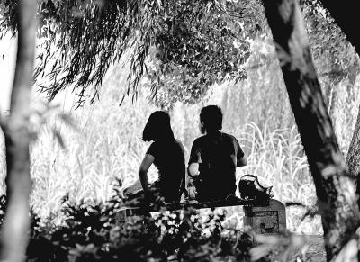 昨天中午,在汉阳江滩临江步道旁的石凳上,一对年轻人正在绿荫下吹着舒爽的江风聊天乘凉。 记者喻志勇 摄
