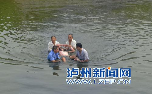 男子河边钓鱼,鱼线不慎勾住高压线,顿时被电流击晕落水。所幸泸县公安局一民警经过,跳下河中和几位村民合力将其救起。