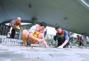 昨日14时,公主坟环路(新兴桥区),三四名工人戴着安全帽,汗流浃背地将地砖一块块对缝拼接。8月16日,这里的城市慢行系统将彻底打通,主辅路也将“祛病”填平,机动车、自行车和行人各行其道。这处西三环路与长安街交接的老堵点有望“消肿”。