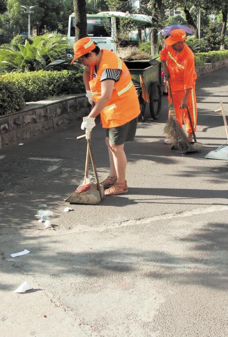高桥党支部的石宽凤是环卫管理员,4时多从雅塘村赶来。她负责韶山路万博汇小区到雨花亭口北这一段卫生。记者见到她时,她正弯腰清扫,头发被汗水浸湿了,结成一缕缕贴在额头上。她告诉记者,许多店主不把垃圾丢到垃圾车里,就倒在绿化带边上。